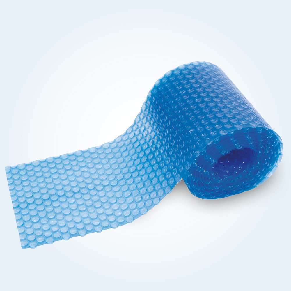 Kraftig, UV-stabiliserad polyetenduk med luftkuddar. Solfolien reducerar värmeförlusten med 70% samt hindrar avdunstningen med 90% samt släpper igenom solvärme (ca 40-60kWh/dag)